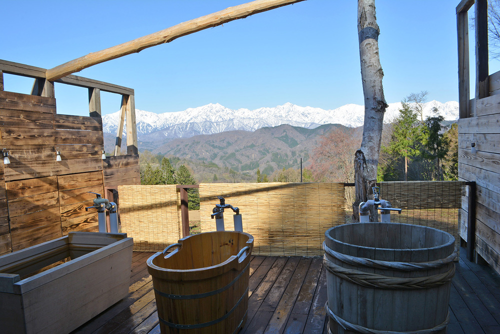当施設は標高800mにある森の中の一軒家で、建物自体が北アルプスを向いて建てられており、展望デッキや露天風呂からは北アルプスが一望できる。また、建物の西側に出ても絶景が見られる。