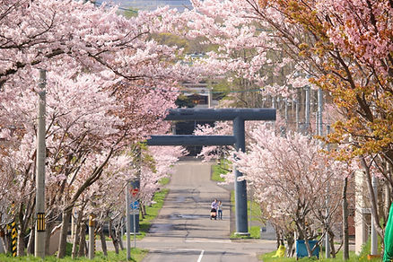 ・岩内神社は桜の木に囲まれた美しい神社で、神社へ延びる参道の桜と背景にある岩内山の残雪はとても美しく桜の名所となっている。