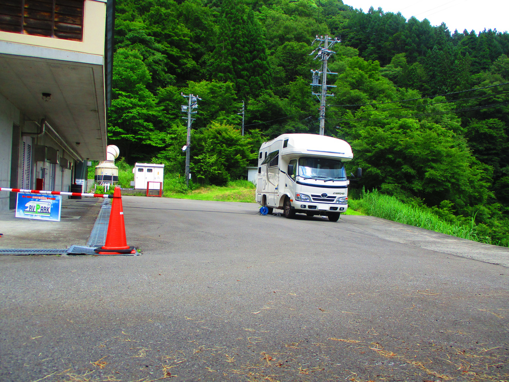 当施設は、その道の駅に併設されたRVパーク。区画サイズは縦7.0m、横4.8mで、トレーラーの場合は分割して並列で利用可能となっている。電源(100V/20A)付き。一部に多少傾斜があるため、気になる場合にはカースロープを無料で借りることができる。